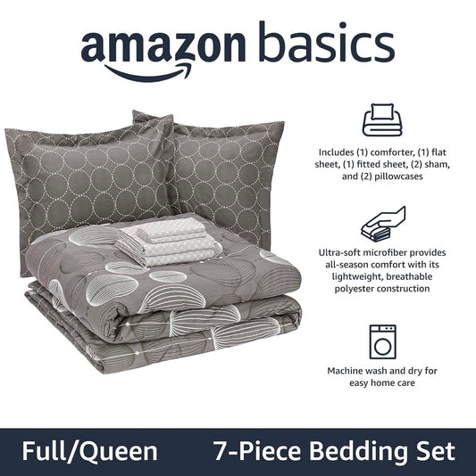 Amazon Basics 7-Piece Lightweight Microfiber Bed-In-A-Bag Comforter Bedding Set - Full/Queen, Industrial Gray